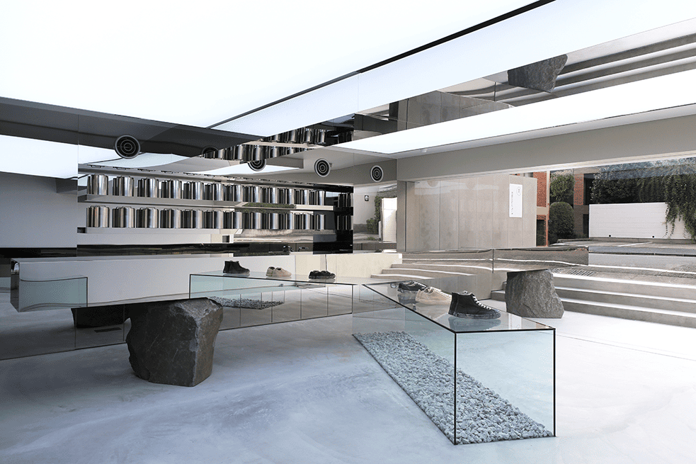 外部と一体感のある店内は、LEDスクリーンやガラス、鏡面、石材の量感のコントラストが効いたミニマルな空間となっています。実験的な内装施工は、「イシマル」と「三保谷硝子店」が手掛けました。