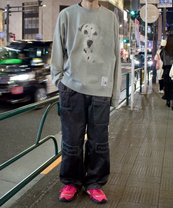 フロントに大きく犬がプリントされたスエットシャツ。